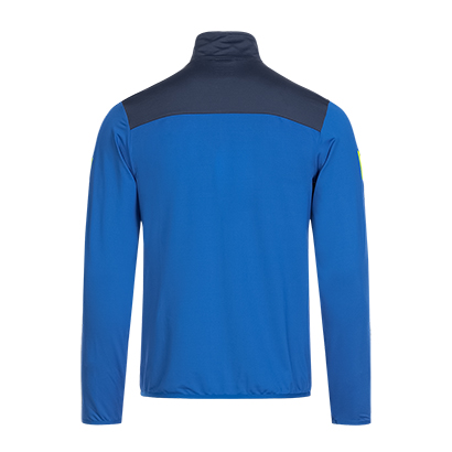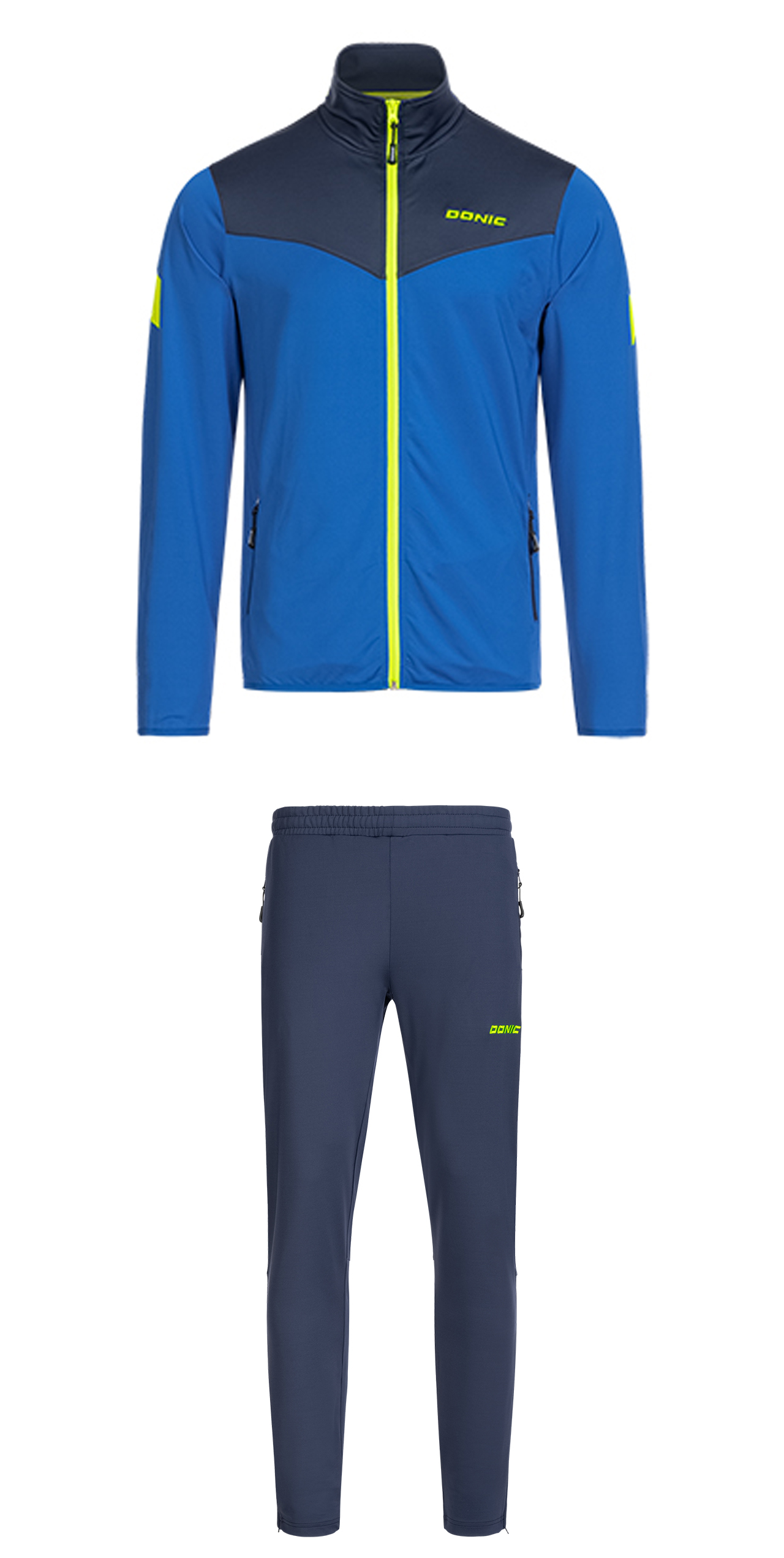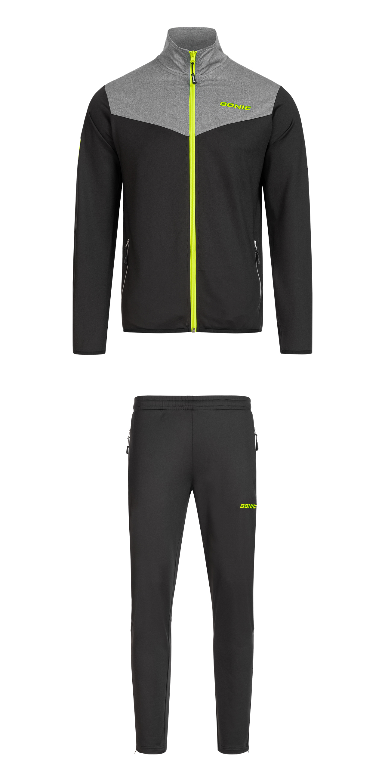 Costum sport elegant, cu o croială care îmbrățișează corpul, cu confort ridicat la purtare. Materialul elastic, cald, elastic, oferă multă libertate de mișcare la încălzire. Jachetă cu inserții contrastante și 2 buzunare laterale cu fermoar. Pantaloni cu talie elastică cu șnur intern și deschidere pentru picior cu fermoar fără manșete.
